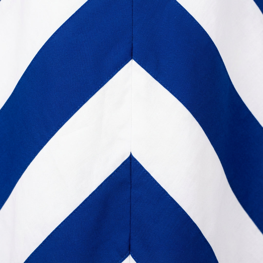 Elevate your wardrobe with a dress designed to capture attention from every angle. This stunning A-line maxi dress features a high-contrast cobalt blue and crisp white color palette, masterfully combined with a sharp chevron pattern that elongates the frame and adds a modern, architectural edge to your look.