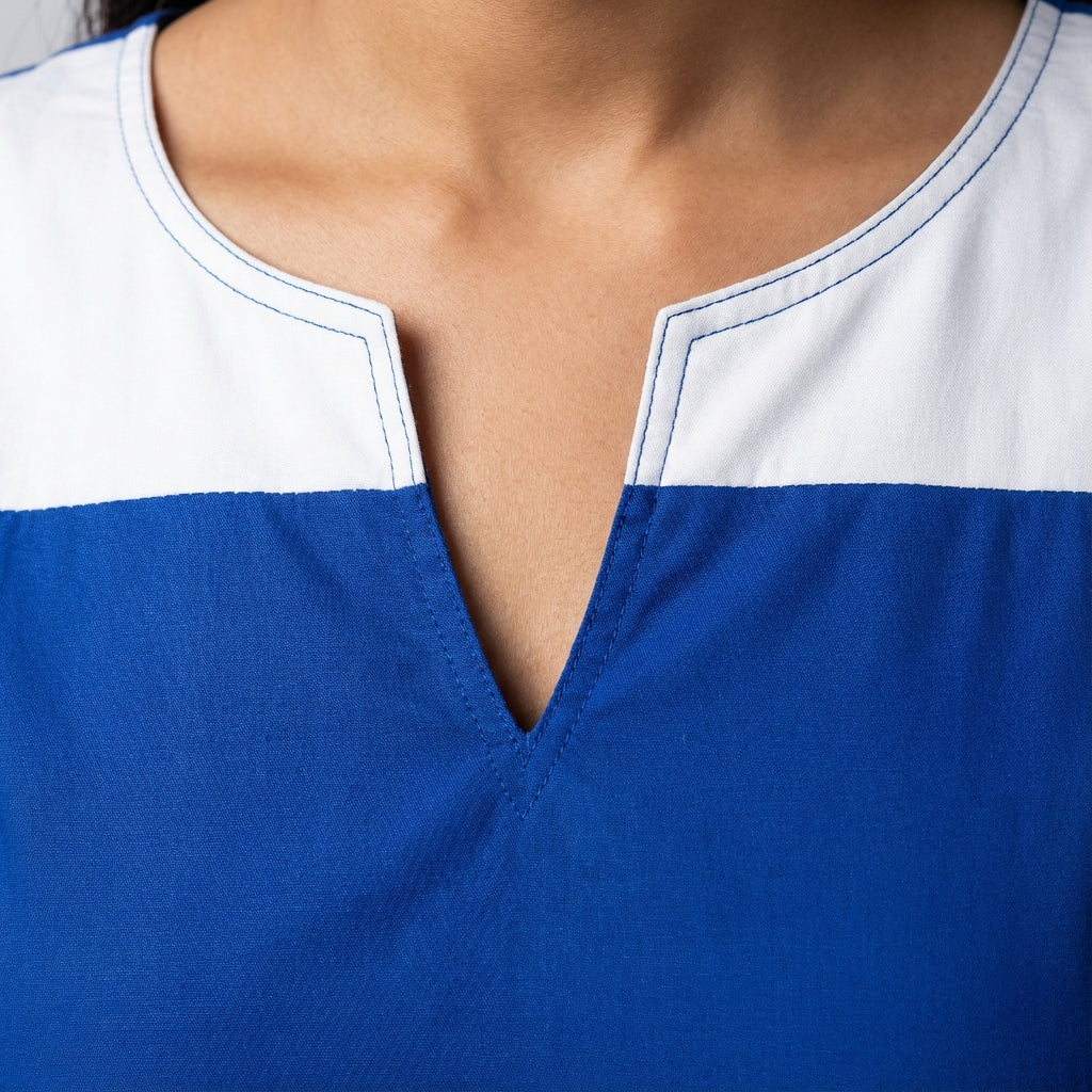 The Bodice: Features a unique split-color yoke with a subtle notched V-neckline that adds a touch of contemporary flair.