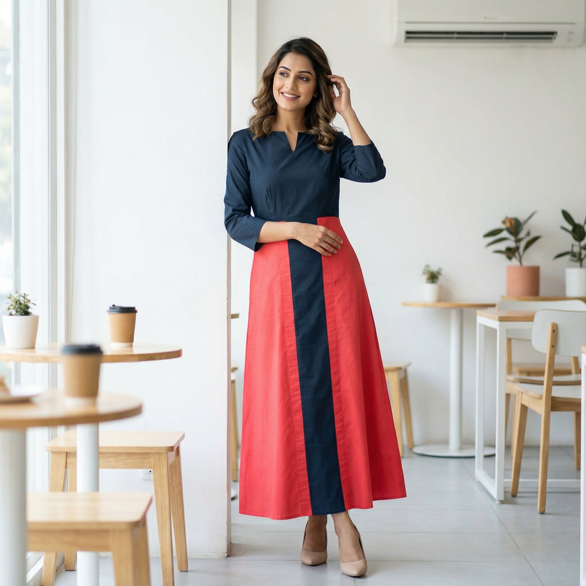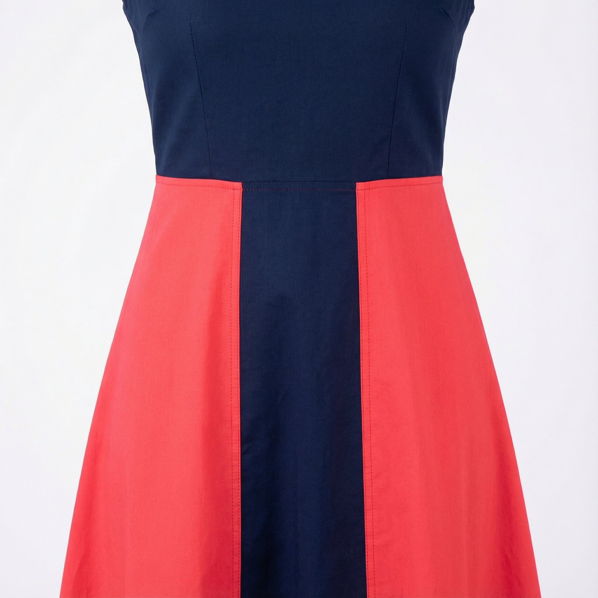 Color-Block Styling: Features a deep navy blue top and a contrasting coral-red skirt with a unique navy vertical panel running down the center for a lengthening effect.