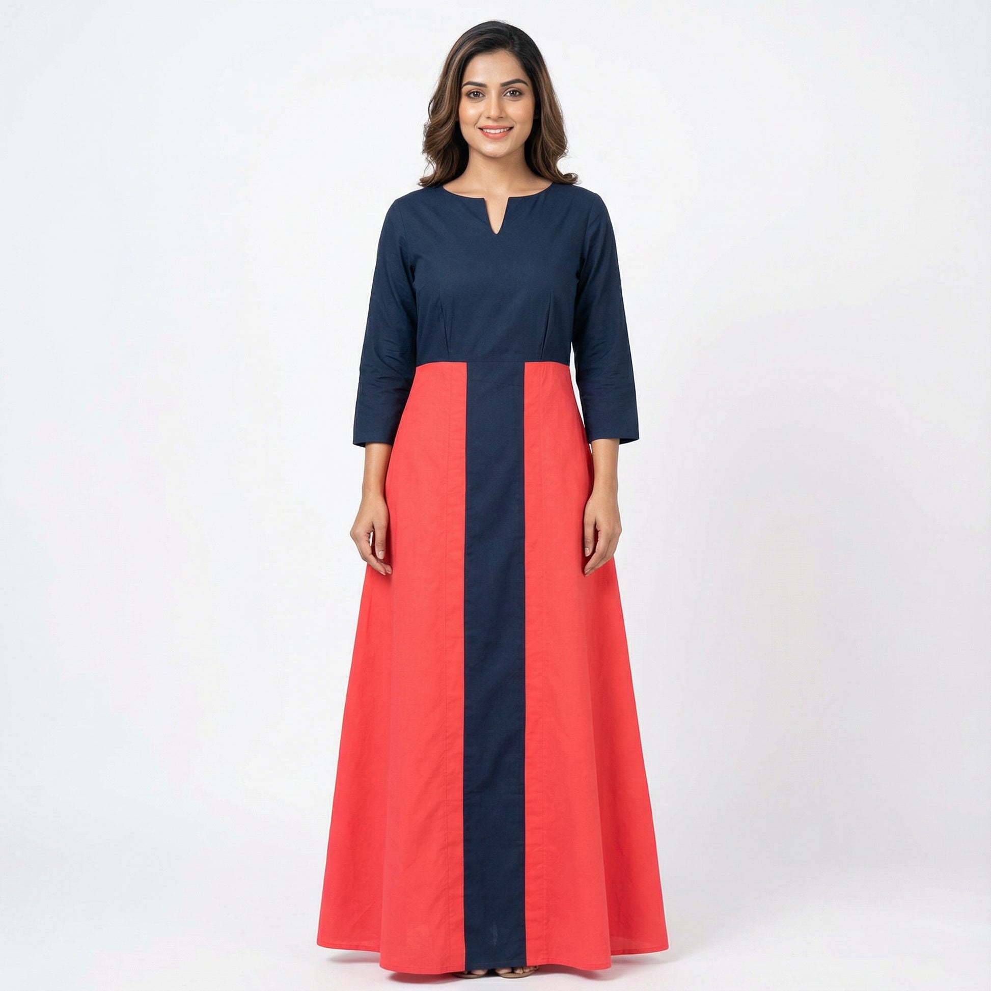 This eye-catching maxi dress features a bold, two-tone color-block design that perfectly balances modern sophistication with a flattering silhouette. Crafted with a navy blue bodice and a vibrant coral-red skirt, this dress is designed to make a statement at any semi-formal event or evening outing.