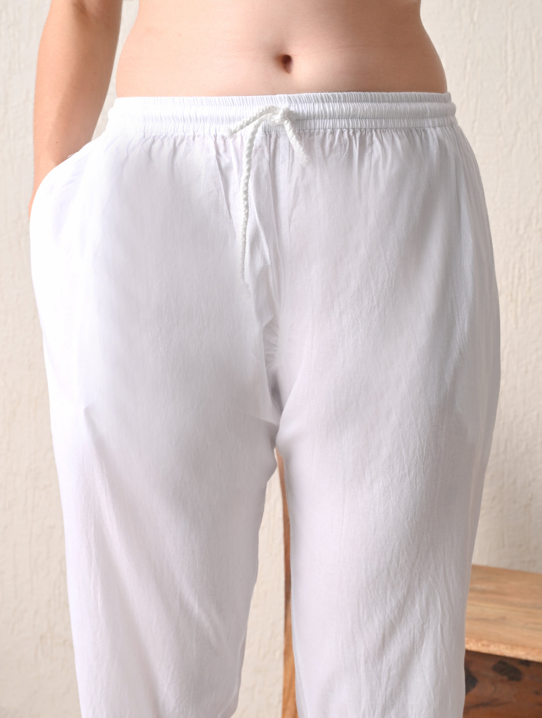 Coordinated Comfort: The set includes matching wide-leg trousers equipped with an elasticated waistband and a functional drawstring for a personalized fit. The hem of the trousers is beautifully finished with intricate white embroidery to mirror the kurta's design.