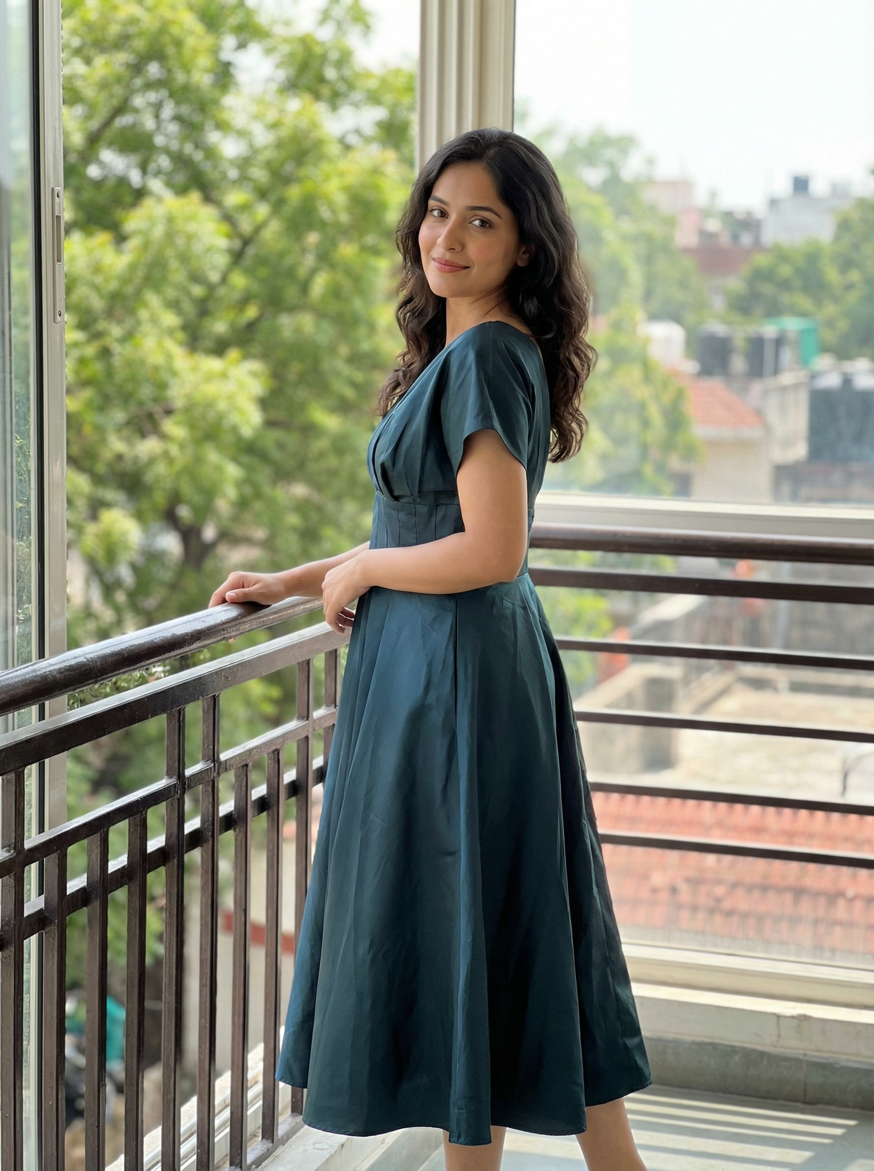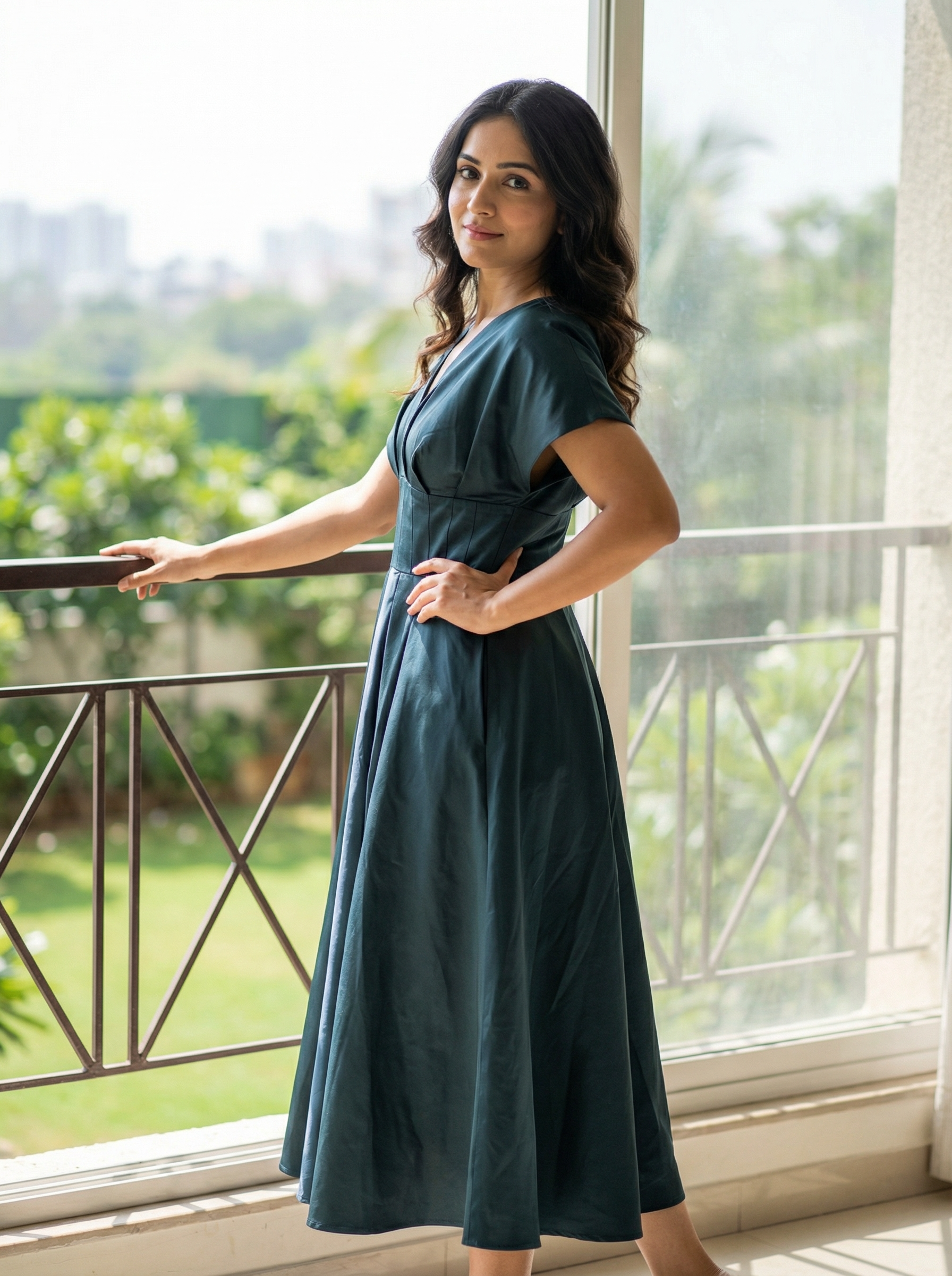 Voluminous A-Line Skirt: The skirt falls into a full, sweeping midi length, utilizing the fabric’s natural body to maintain a grand, flared shape.