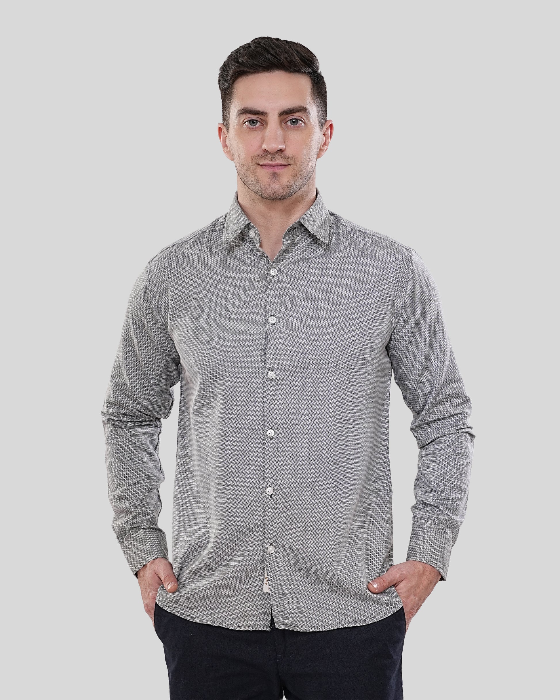 Redefine your "smart-casual" standard with this versatile charcoal-grey essential. Featuring a high-definition micro-pattern that creates a rich, textured appearance from a distance, this shirt offers a sophisticated alternative to solid colors. Whether tucked in for a high-stakes meeting or worn open over a tee for a weekend gallery crawl, it’s the ultimate wardrobe chameleon.